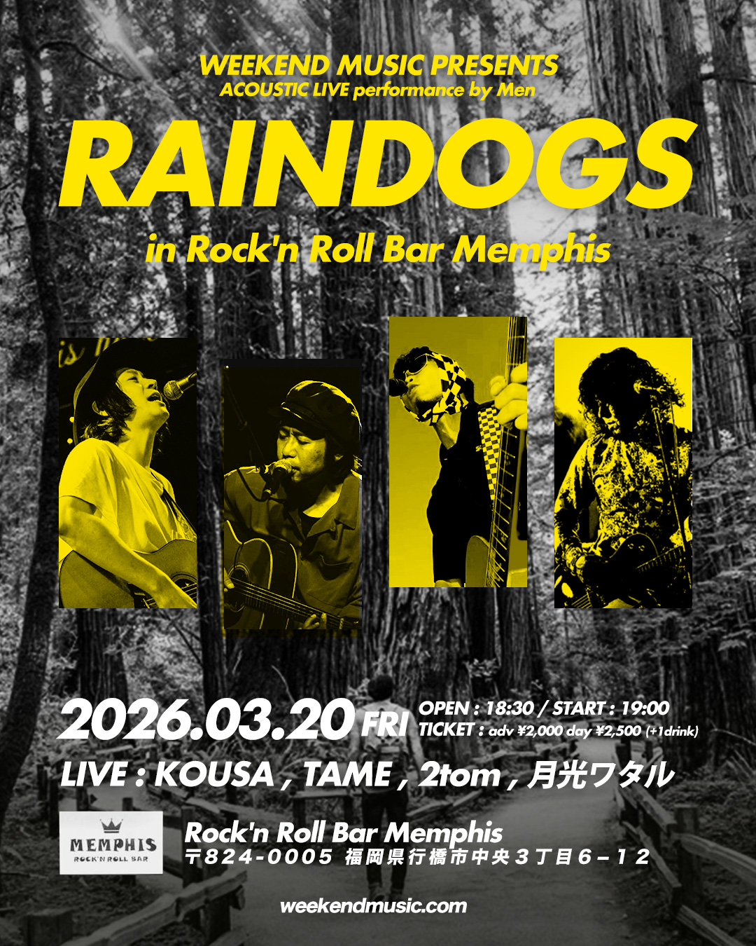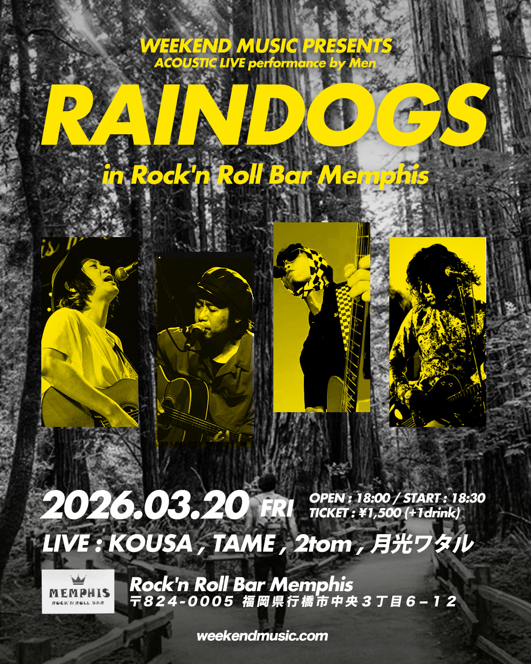 会場:行橋 Rock’n roll bar Memphis 開場:18:30 スタート 19:00 チケット:adv ¥1,500 / day ¥2,000 (+1drink) 予約方法:出演者及び会場など 出演: KOUSA TAME 2tom (No Future AcouSkatic 楽団) 月光ワタル チケット予約やお問い合わせ: WEEKEND MUSIC https://weekend… (詳しくはこちら)