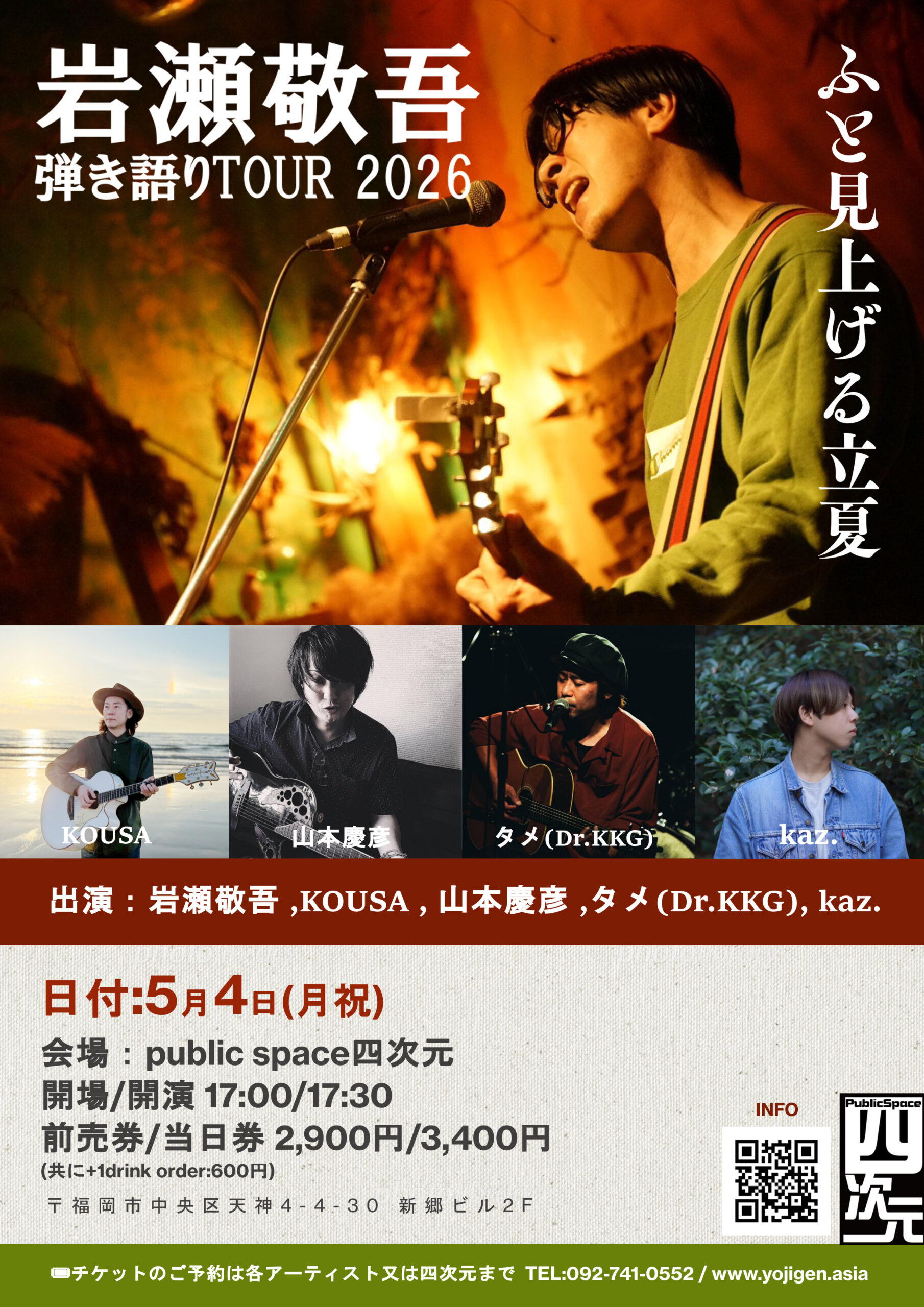 岩瀬敬吾 弾き語りTOUR 2026 【ふと見上げる立夏】 at public space四次元 〒810-0001 福岡市中央区天神4丁目4番30号新郷ビル2F TEL:092-741-0552/www.yojigen.asia 開場/開演 17:00/17:30 前売券/当日券 2,900円/3,400円 (共に+1drink order:600円) 🎫チケットのご予約は各アーティスト又は四次… (詳しくはこちら)
