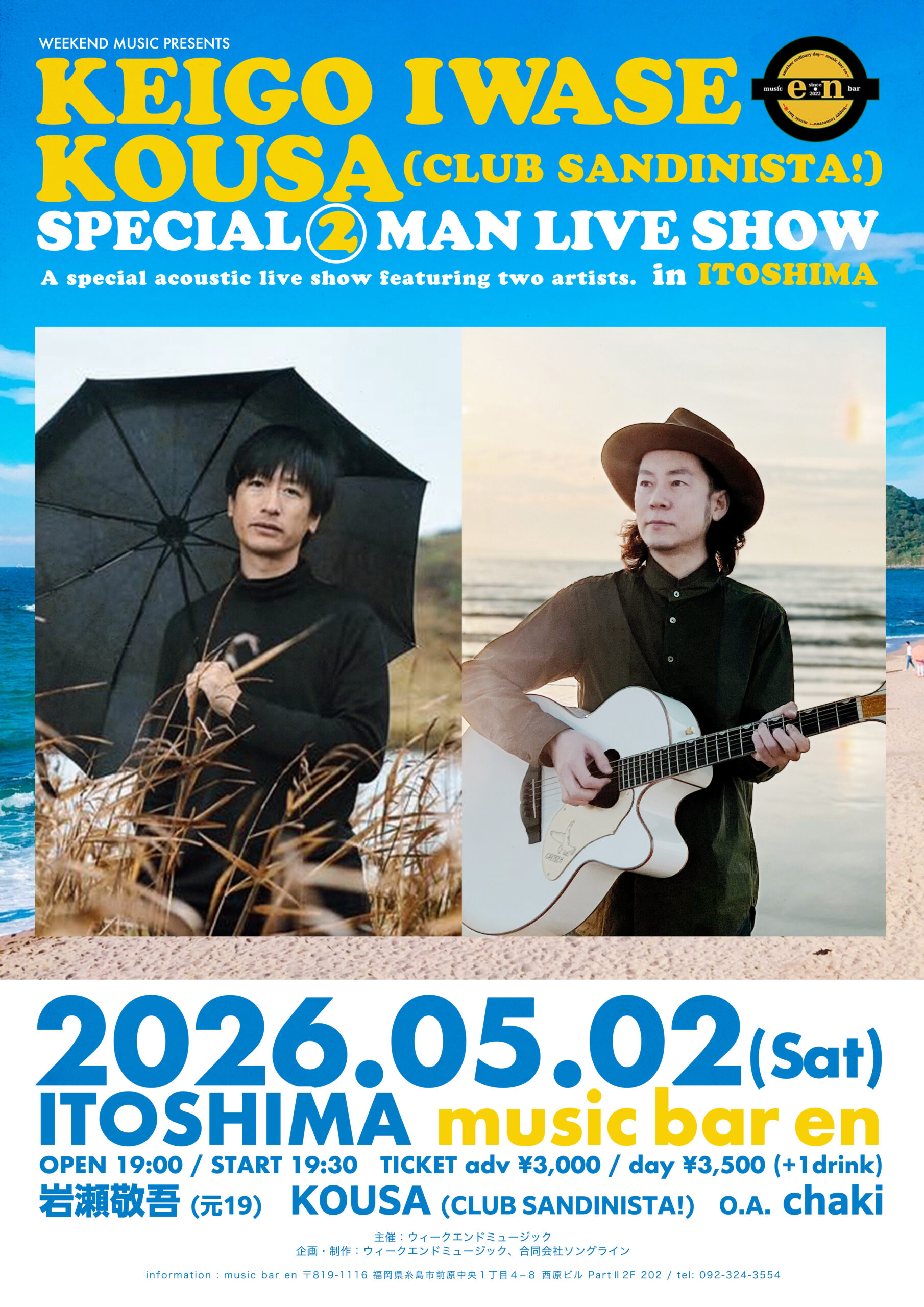 WEEKEND MUSIC Presents 【岩瀬敬吾 × KOUSA Special 2 Man Live in 糸島】 会場 糸島 music bar en 開場19:00 / 開演 19:30 チケット(予約制 限定25名) ¥3,000(前売) / ¥3,500(当日) 共に1ドリンクオーダー 出演 岩瀬敬吾 / KOUSA (CLUB SANDINISTA!) / O.A. chaki… (詳しくはこちら)